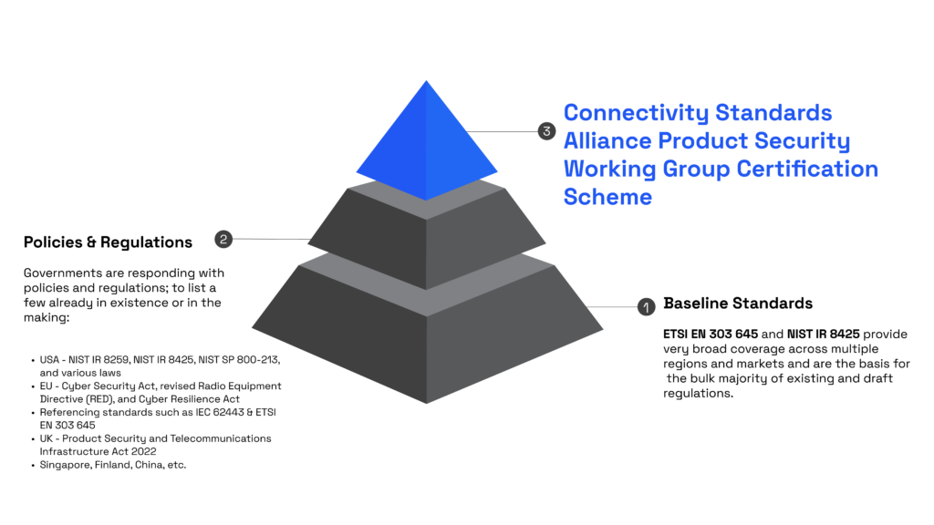 The Product Security certification is based on the requirements included in national, regional, and international standards related to IoT product security. We expect that products that receive the Alliance Product Security certification will also comply with these other standards, simplifying the certification process for product manufacturers and consumers alike.